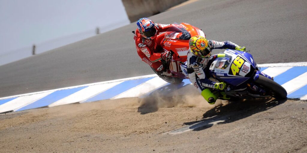 2008 Laguna Seca Grand Prix’si, Rossi’nin Avustralyalı genç yetenek Casey Stoner’a karşı verdiği mücadelenin simgesi oldu. Stoner’ın inanılmaz düz yol hızına karşı Rossi, akıl oyunları ve riskli taktikler kullandı.