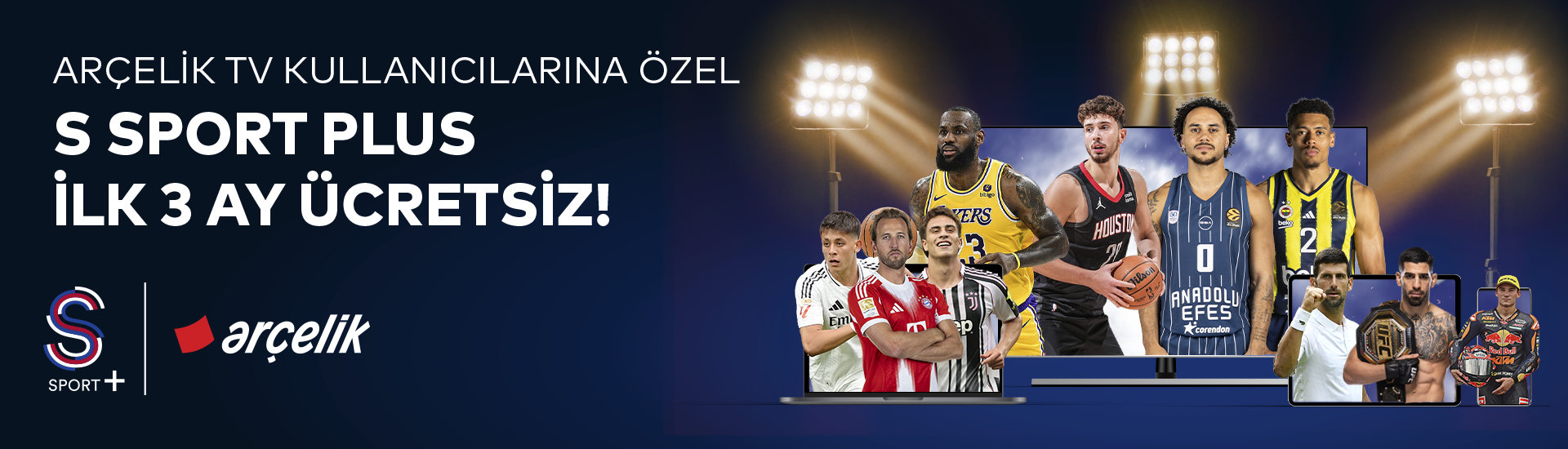 Bu kampanya ile Arçelik TV kullanıcılarına S Sport Plus paketi ilk 3 ay ücretsiz sunulmaktadır. Üyeliğinizi iptal etmediğiniz takdirde, indirimli kampanya döneminin ardından S Sport Plus aylık paket üyeliğiniz, otomatik yenileme özelliğiyle takip eden dönem için güncel fiyatlar ile yenilenir. S Sport Plus kullanımınıza bağlı olarak kullanmakta olduğunuz internet paketinizin kotası etkilenebilir. İnternet tüketimine bağlı oluşabilecek ek maliyetler kullanıcıya aittir. Kampanya 30 Kasım 2025 tarihine kadar geçerlidir. Kampanyadan her bir kullanıcı bir kereye mahsus olarak faydalanabilir.