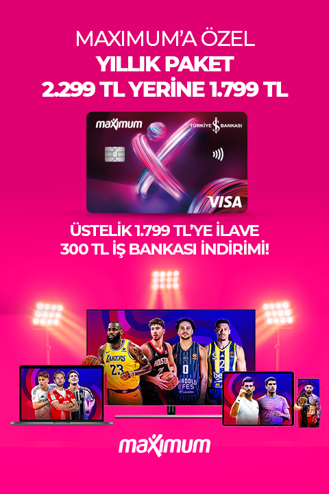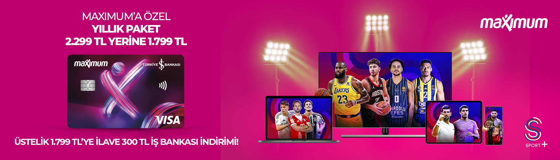S Sport Plus’a ilk kez üye olacak Maximum kart sahipleri EuroLeague’den LaLiga’ya, Serie A’dan Bundesliga’ya, NBA’den UFC’ye, tenisten boks gecelerine dünyanın önde gelen spor organizasyonlarını S Sport Plus ayrıcalığıyla ister Smart TV’den, ister webten, ister cepten Tekrar-İzle özelliği ile S Sport Plus Yıllık Paketi 2.299 TL yerine 1.799 TL’ye ek olarak 300 TL İş Bankası indirimiyle (toplamda yıllık 1.499 TL) izliyor!