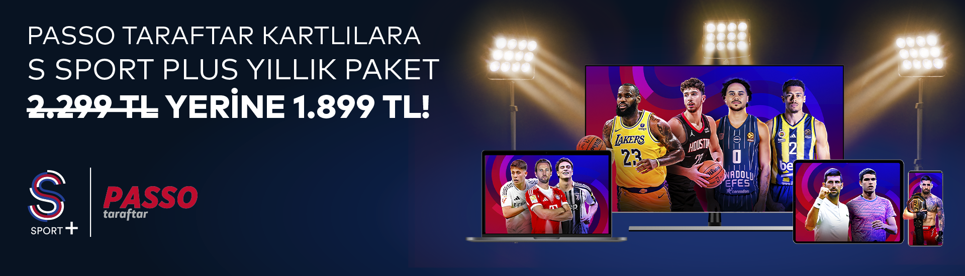 Kampanyadan yararlanan Passo Taraftar Kartlılar, S Sport Plus’ta yer alan Serie A, NBA, NFL, Nascar, Indycar, UFC ve boks geceleri başta olmak üzere S Sport Plus üzerinden gerçekleştirilen tüm canlı yayınları, Tekrar-izle özellikli yayınları, filmleri ve belgeselleri S Sport Plus yıllık paket ile 2299 yerine 1899’a izleyebilir. S Sport Plus paket içeriklerini değiştirme hakkını saklı tutar.