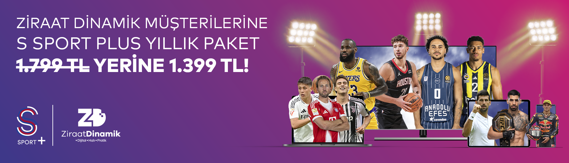 Ziraat Dinamik müşterileri EuroLeague’den LaLiga’ya, Serie A’dan Bundesliga’ya, NBA’den UFC’ye, tenisten boks gecelerine dünyanın önde gelen spor organizasyonlarını S Sport Plus ayrıcalığıyla ister Smart TV’den, ister webten, ister cepten Tekrar-İzle özelliği ile S Sport Plus yıllık paketi 1799 yerine 1399’a izliyor!