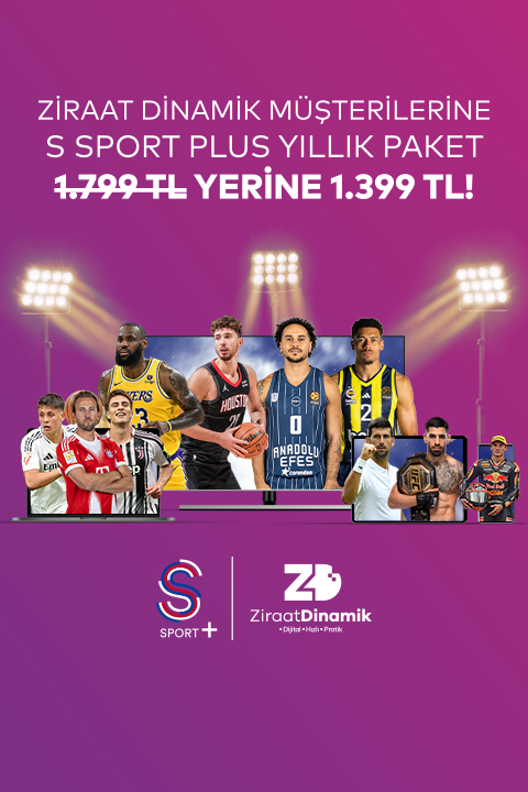 Bu kampanya ile Ziraat Dinamik müşterilerine S Sport Plus yıllık paketi 1799 yerine 1399’a sunulmaktadır. Üyeliğinizi iptal etmediğiniz takdirde, indirimli kampanya döneminin ardından S Sport Plus yıllık paket üyeliğiniz, otomatik yenileme özelliğiyle takip eden dönem için güncel fiyatlar ile yenilenir. S Sport Plus kullanımınıza bağlı olarak kullanmakta olduğunuz internet paketinizin kotası etkilenebilir. İnternet tüketimine bağlı oluşabilecek ek maliyetler kullanıcıya aittir. Kampanya 31 Aralık 2025 tarihine kadar geçerlidir. Kampanyadan her bir kullanıcı bir kereye mahsus olarak faydalanabilir.