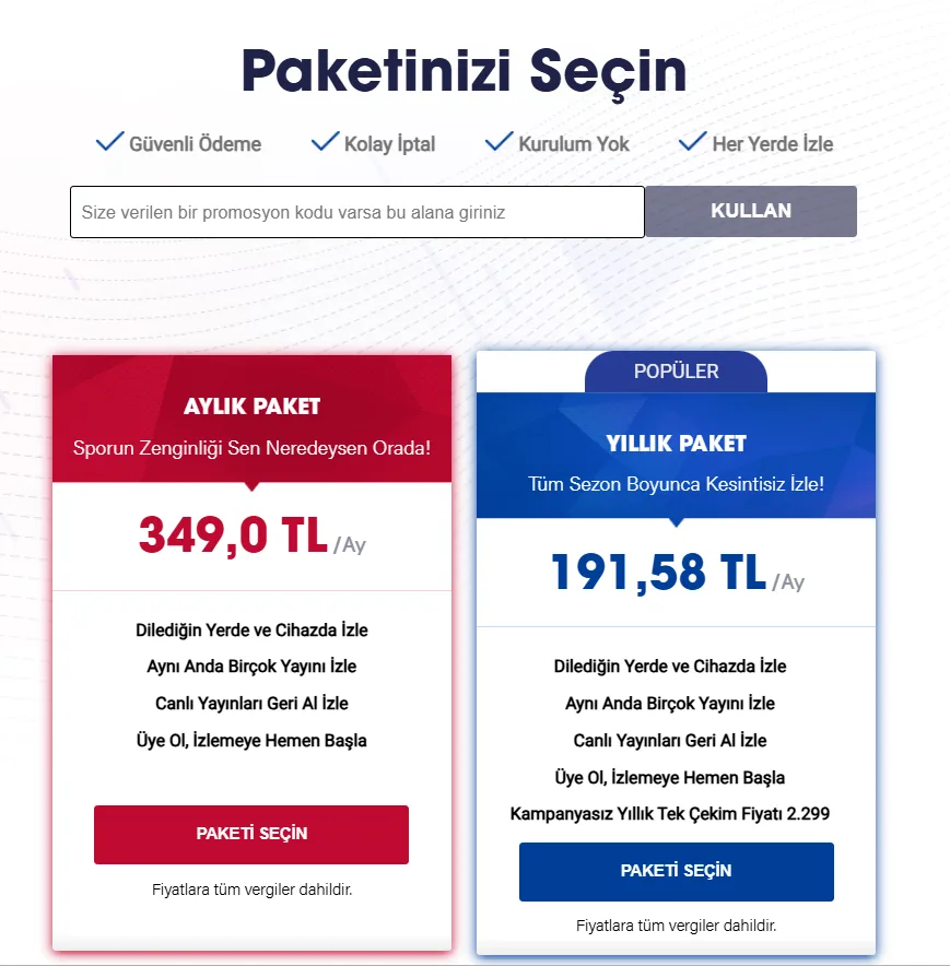 Üyelik aşamasının ilk adımında sizden istenen bilgileri girdikten sonra, 2. adımda promosyon kodu ekranına ulaşacaksınız. Bu adımda ‘’PROMOSYON KODU’’ alanına Oyunfor üzerinden satın aldığınız üyelik kodunu girip ‘’Kullan’’ butonuna basmanız yeterlidir. Paket seçimi yapmanıza gerek yoktur. Yönlendirme sonrası S Sport Plus’u hemen keşfetmeye başlayabilirsiniz.
